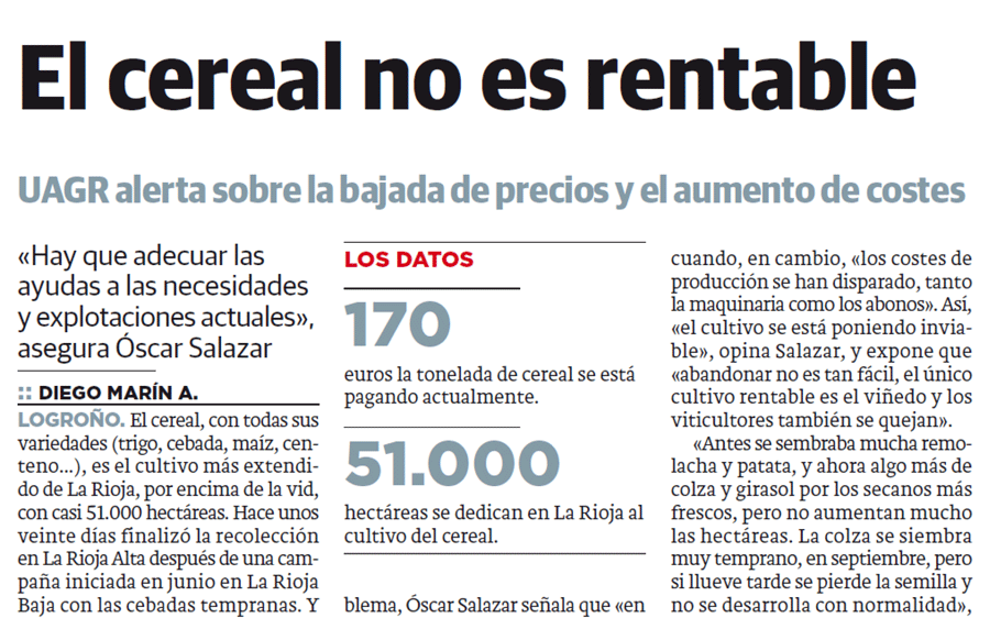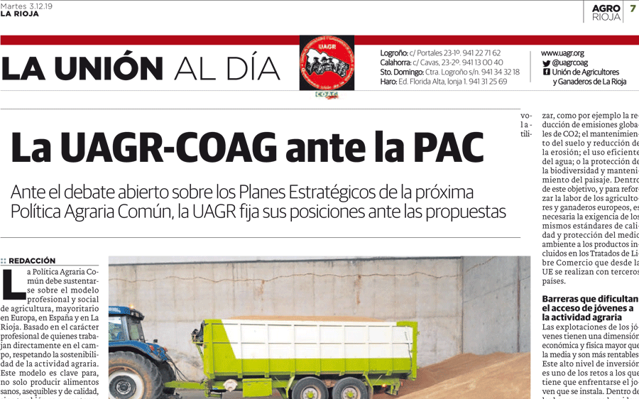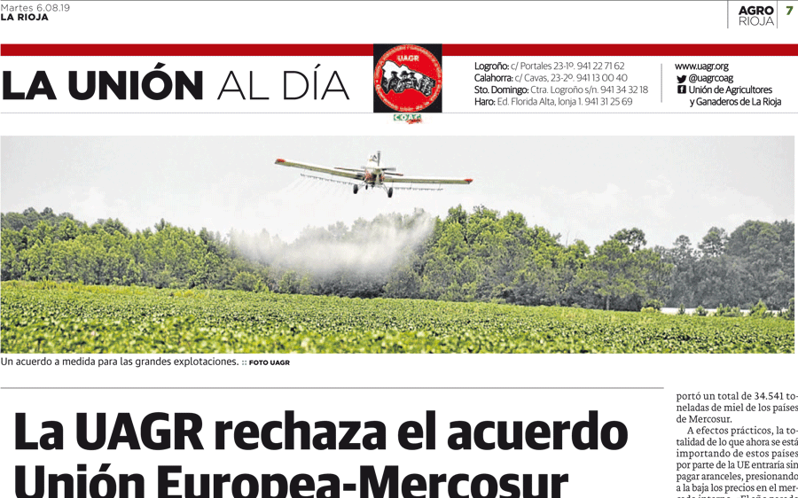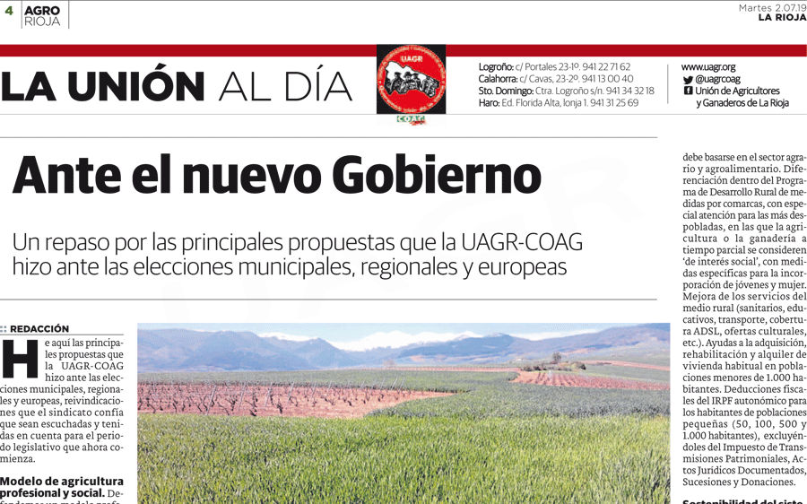7 de agosto Rechazamos el acuerdo UE-Mercosur Así lo detalla nuestra página en el suplemento AGRO del diario La Rioja, publicada el martes 6 de agosto. 17 de julio La UAGR-COAG rechaza que se permita en las normas de campaña la posible generación de más vino común en la DOC Rioja La Unión de Agricultores ha votado en contra de las normas de campaña aprobadas en la DOCa Rioja para 2019 debido a que el mal llamado stock cualitativo solo servirá para generar más vino común en un contexto de descenso de ventas y exceso de existencias.