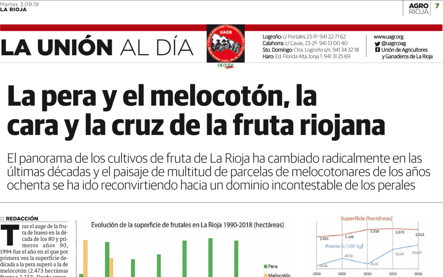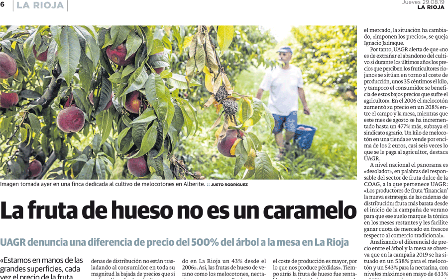 4 de septiembre Artículo sobre la situación de la fruta riojana Ayer, en nuestra página menusal en el suplemento AGRO del diario La Rioja, detallamos la situación de la fruta riojana: Cara para la pera, cruz para el melocotón. Pincha en la imagen para leerlo. 30 de agosto Reportaje sobre la crisis de la fruta de hueso Ayer publicaba diario La Rioja un reportaje sobre la crisis que no cesa en el sector de la fruta de hueso, melocotón y nectarina, principalmente. Declaraciones de Ignacio Jadraque, responsable de fruta de nuestro sindicato. Pincha en la imagen para descargarte la noticia. 29 de agosto El cereal no es rentable Reportaje en diario La Rioja ayer miércoles sobre los problemas del sector cerealista, con declaraciones del presidente de la UAGR-COAG, Óscar Salazar. Pincha en la imagen para descargarte la noticia. 23 de agosto Nueva campaña de fruta de hueso ruinosa para el agricultor Las grandes cadenas distribución no están trasladando al consumidor en toda su magnitud la bajada de precios que sí están aplicando al agricultor. El resultado, un diferencial que roza en La Rioja el 500% del árbol a la mesa. Tras varias campañas consecutivas con precios por debajo del umbral de rentabilidad, la superficie dedicada al cultivo de melocotón ha descendido en La Rioja un 43% desde 2006. Los melocotones, nectarinas, paraguayos o albaricoques riojanos, conocidos por su gran calidad, no resultan rentables para sus cultivadores. Por este motivo, la superficie dedicada a melocotón ha descendido de las 732 hectáreas de 2006 a las 416 registradas actualmente. No es de extrañar este abandono del cultivo si durante los últimos años los precios que perciben los fruticultores riojanos se sitúan entorno al coste de producción, unos 35 céntimos el kilo. Tampoco el consumidor se beneficia de estos bajos precios que sufre el agricultor: Si en 2006 el melocotón aumentaba su precio en un 208% entre el campo y la mesa, este mes lo hace un 477% más. Así, mientras que el productor cobra 35 céntimos, en las tiendas el precio medio que se paga por un kilo de melocotones está por encima de los dos euros.