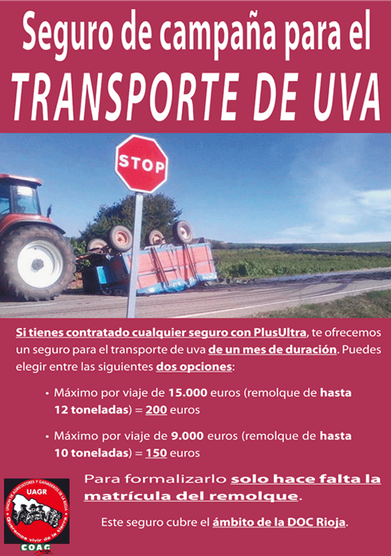 11 de septiembre Asegura el transporte de la uva En nuestras oficinas puedes contratar un seguro de transporte para la uva de un mes de duración. Infórmate en cualquiera de ellas o en el 941227162.