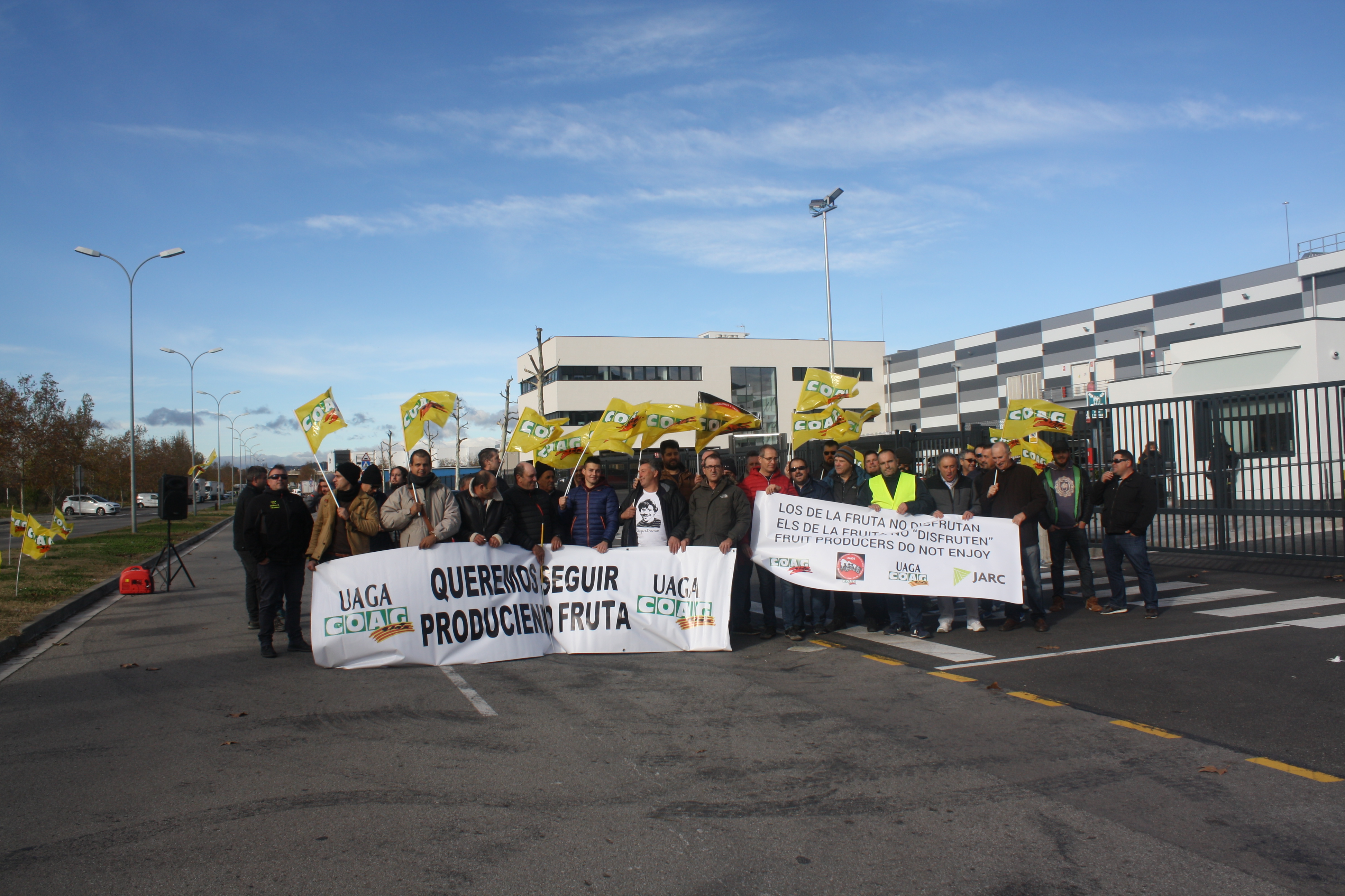 Las macromagnitudes oficiales son más que elocuentes. En 2019, según los datos publicados por Eurostat, la renta agraria en España se ha desplomado un 8,6%, por la caída de valor de la producción de un 3% y el aumento de los costes de producción en un 3,6%. Estas cifras reflejan la presión a la que está sometidos los profesionales agrarios por ambos lado de la cadena. Por un lado, vía costes, unos fabricantes de insumos (fitosanitarios, fertilizantes, semillas, energía, etc..) que tienden a la composición de monopolios. Cada vez menos empresas, más grandes y poderosas. Como ejemplo, las fusiones de los últimos años de Monsanto + Bayer, Dow + DuPont, o Syngenta + ChemChina. Por el otro extremo, una distribución fuertemente concentrada: las seis primeras cadenas distribución concentran el 55% de la cuota de mercado en España, según cifras de Kantar Worldpanel para junio de 2019. “La cadena alimentaria sigue absolutamente desequilibrada y el valor que genera no llega a los agricultores. El elevado poder de mercado de ambos extremos nos deja claro quién impone los costes y precios, situando a las pequeñas y medianas explotaciones por debajo del umbral de rentabilidad", ha argumentado Miguel Blanco, Secretario General de COAG. A todo ello habría que sumar las múltiples amenazas que se ciernen sobre el sector, caso del Brexit, el pleno desarrollo de acuerdos de libre comercio de la UE con terceros países (Mercosur, próximos Australia y Nueva Zelanda), las importaciones masivas sin control de estándares de calidad, seguridad alimentaria, sostenibilidad ambiental y condiciones laborales y sociales, (caso de las frutas y hortalizas procedentes de Marruecos), la salvaje política arancelaria de la administración Trump, el desmantelamiento de los sistemas de regulación de mercados y del principio básico de preferencia comunitaria en el seno de la UE, así como la creciente ola de criminalización de la actividad agrícola y ganadera por parte de los movimientos fundamentalista del animalismo y de los grupos ecologistas más ultras y radicales. "A nivel social, el sector agrario debe ser reconocido por su carácter estratégico como productor de alimentos de calidad, saludables y suficientes, vertebrador del territorio, garante de un medio natural sostenible frentre la cambio climático y freno más eficaz contra el acelerado proceso de despoblamiento de la España vaciada", ha apostillado el Secretario General de COAG, a lo que ha añadido; “la consolidación de un modelo social y profesional de agricultura fuerte y con futuro, que garantice el relevo generacional, debe ser una cuestión de Estado y como tal tiene que estar en las prioridades de la agenda política de la nueva legislatura”, ha afirmado. 13 de diciembreParticipamos en los actos de protesta de COAG frente a los principales centros logísticos de la gran distribución alimentaria El presidente de la Unión de Agricultores y Ganaderos de La Rioja, Óscar Salazar, y el coordinador sindical Luis Torres, han participado en la concentración de Barcelona frente a una gran plataforma de abastecimiento a superficies comerciales.